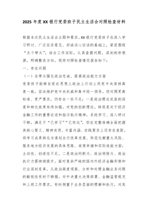 2025年度XX银行党委班子民主生活会对照检查材料