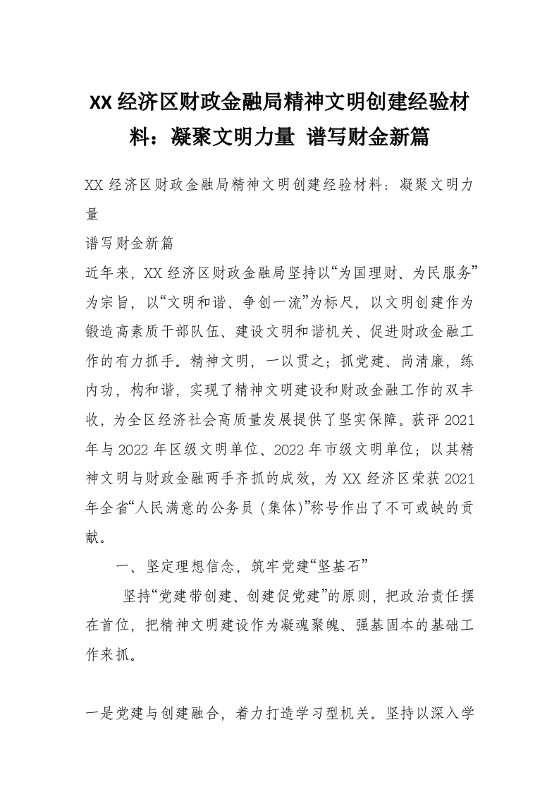 XX经济区财政金融局精神文明创建经验材料:凝聚文明力量 谱写财金新篇