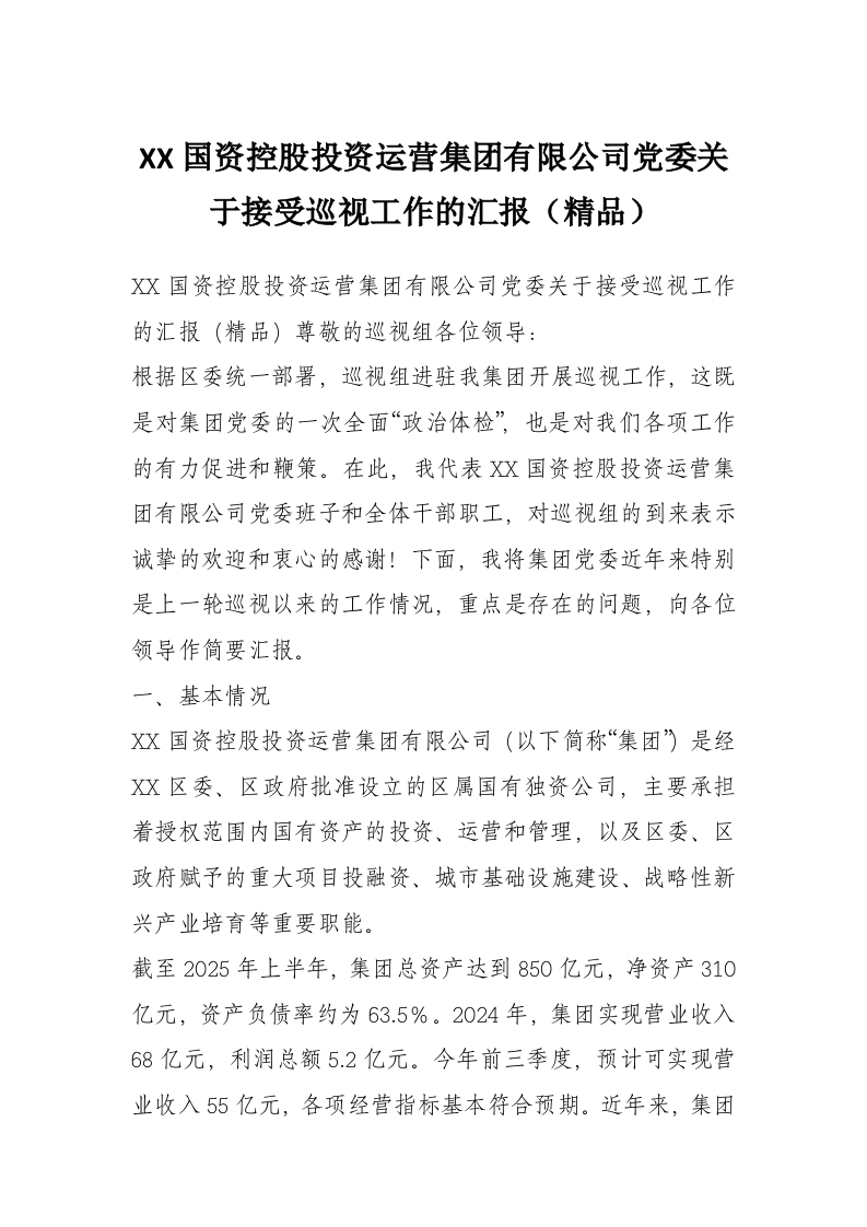 XX国资控股投资运营集团有限公司党委关于接受巡视工作的汇报(精品)