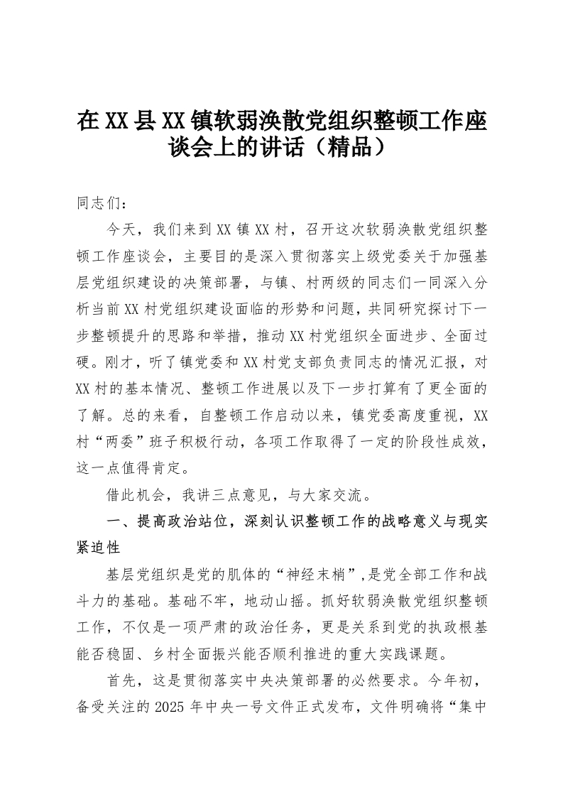 在XX县XX镇软弱涣散党组织整顿工作座谈会上的讲话(精品)