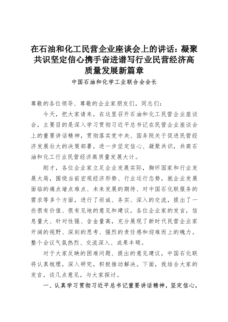在石油和化工民营企业座谈会上的讲话:凝聚共识坚定信心携手奋进谱写行业民营经济高质量发展新篇章