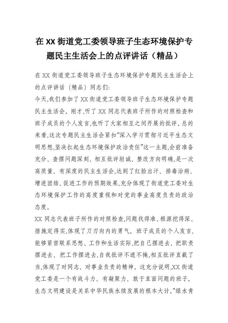 在XX街道党工委领导班子生态环境保护专题民主生活会上的点评讲话(精品)