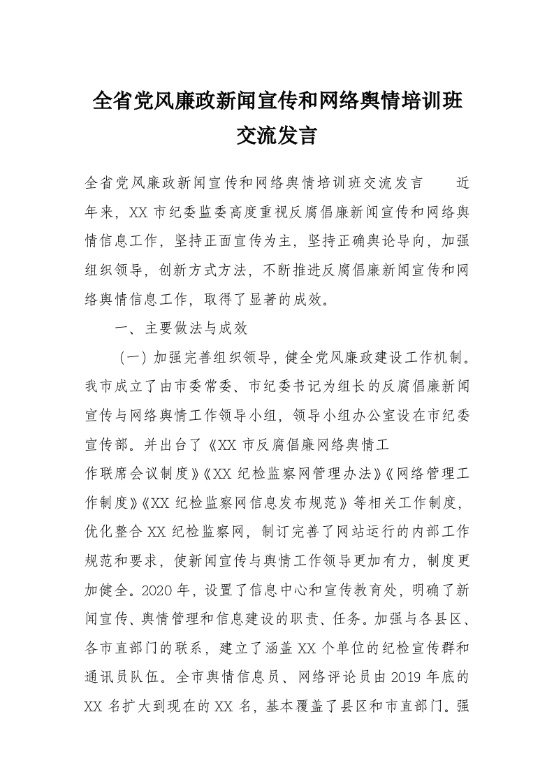 全省党风廉政新闻宣传和网络舆情培训班交流发言