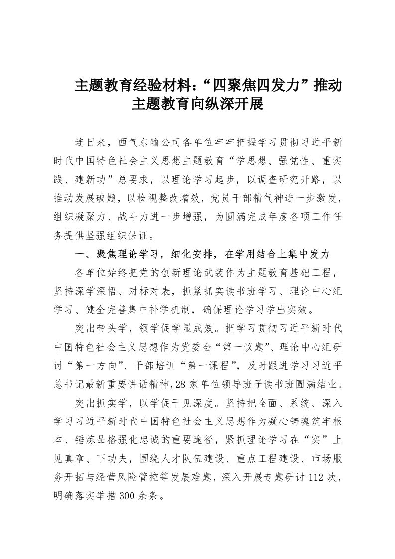 首页工作文档主题教育经验材料:“四聚焦四发力”推动主题教育向纵深开展
