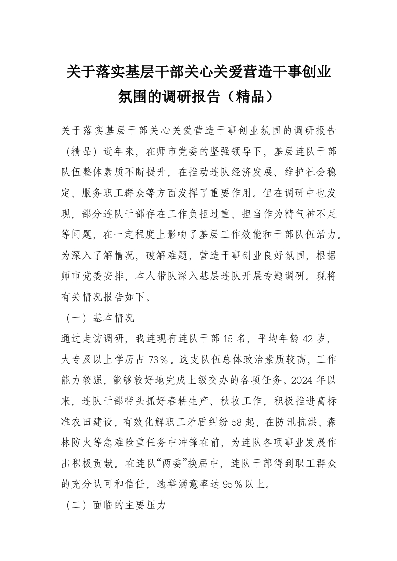 关于落实基层干部关心关爱营造干事创业氛围的调研报告(精品)