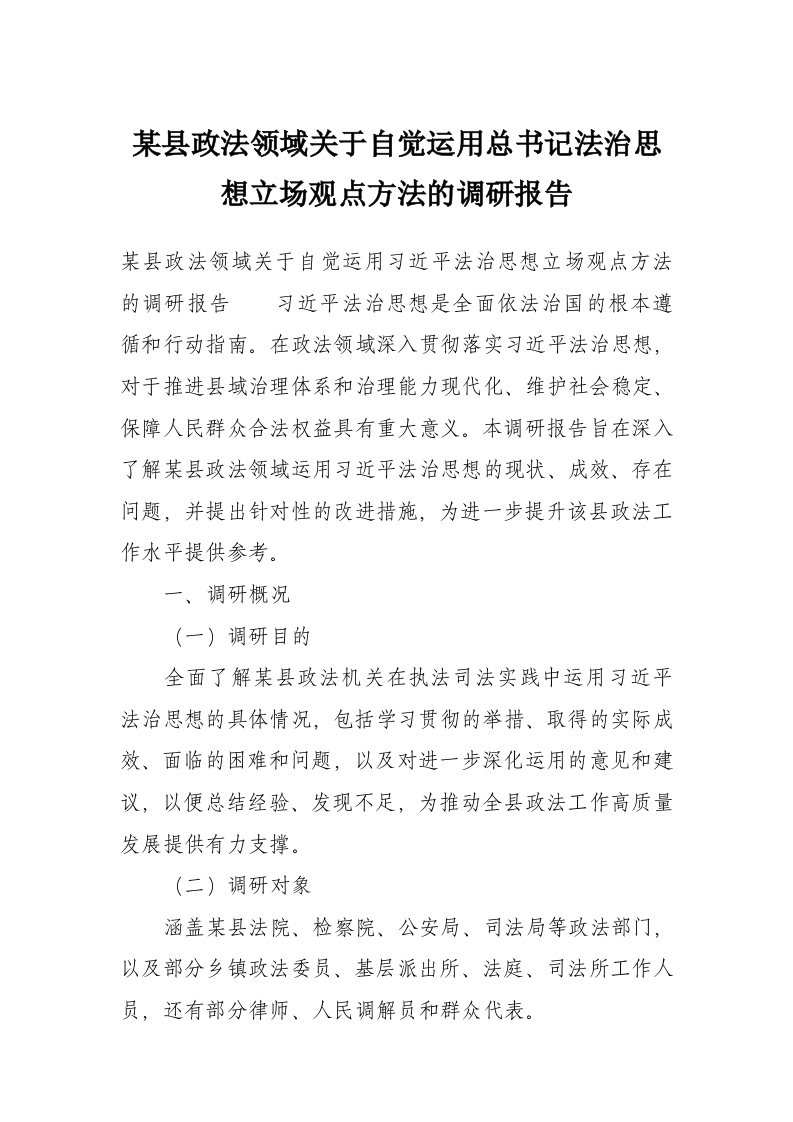 某县政法领域关于自觉运用总书记法治思想立场观点方法的调研报告