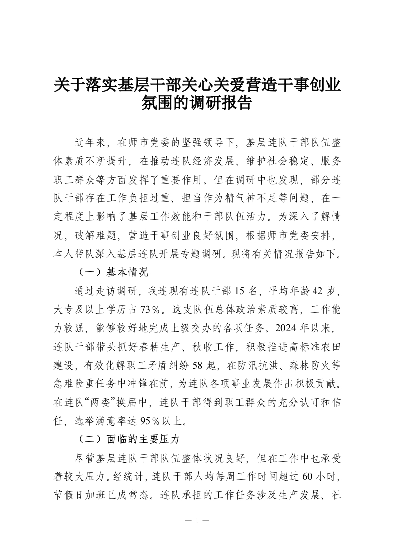 关于落实基层干部关心关爱营造干事创业氛围的调研报告