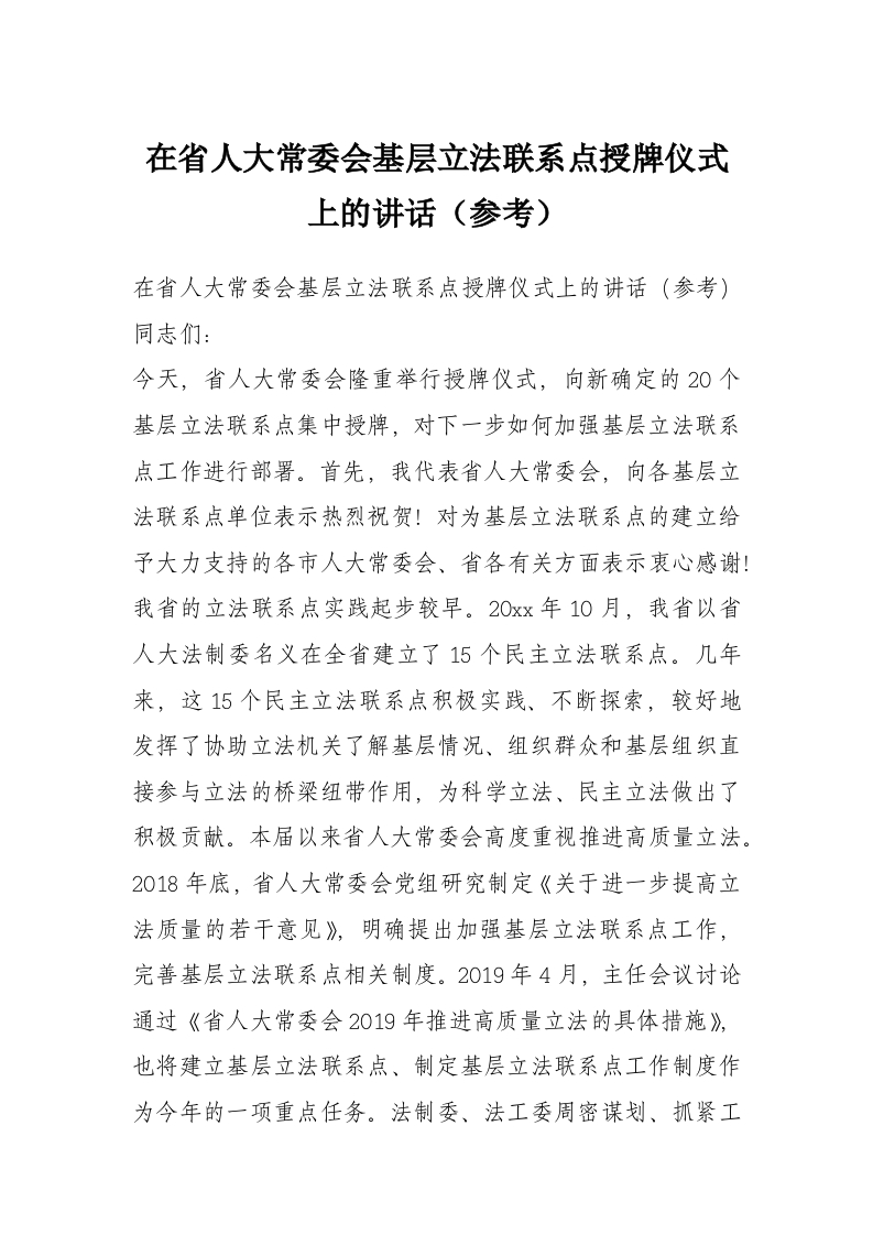 在省人大常委会基层立法联系点授牌仪式上的讲话(参考)