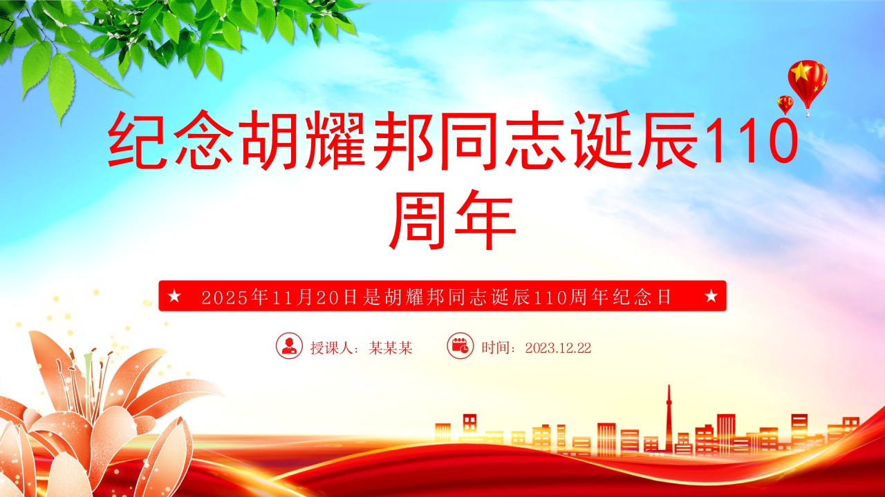 首页PPT模板党建风纪念胡耀邦同志诞辰110周年PPT主题课件