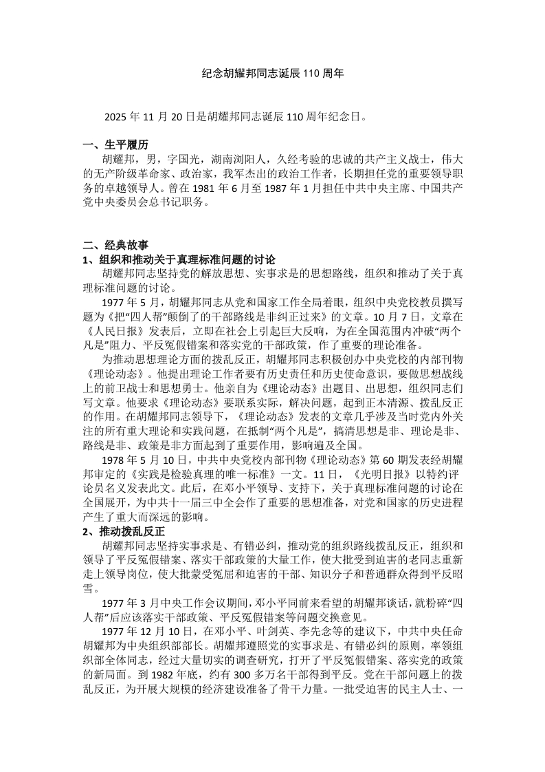 党建风纪念胡耀邦同志诞辰110周年PPT主题课件(讲稿)