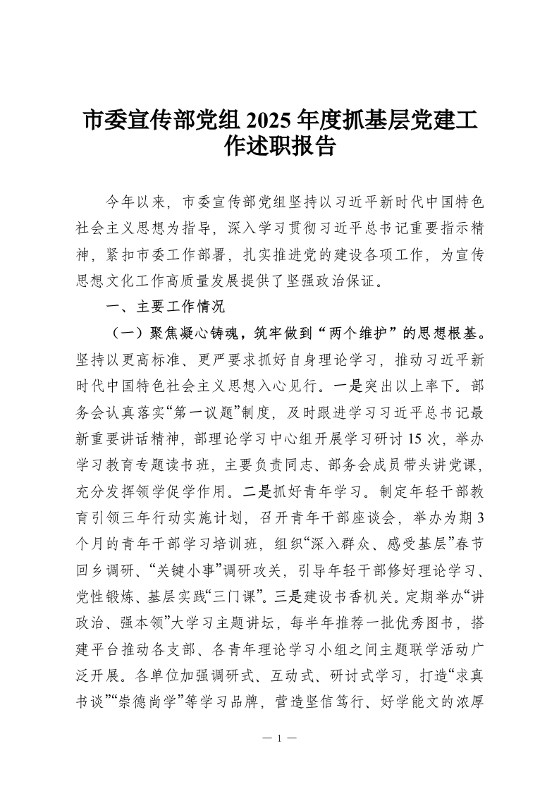 市委宣传部党组2025年度抓基层党建工作述职报告