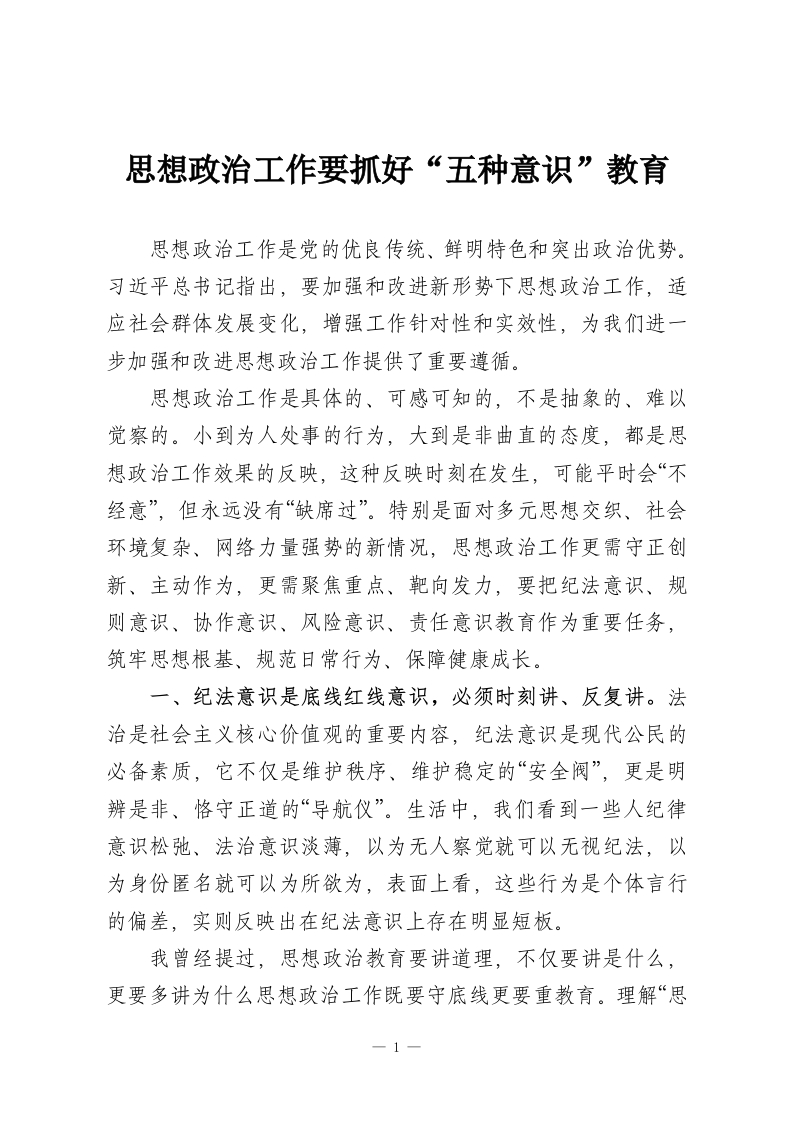首页讲课讲稿思想政治工作要抓好“五种意识”教育