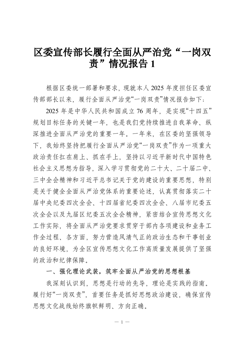区委宣传部长履行全面从严治党“一岗双责”情况报告1