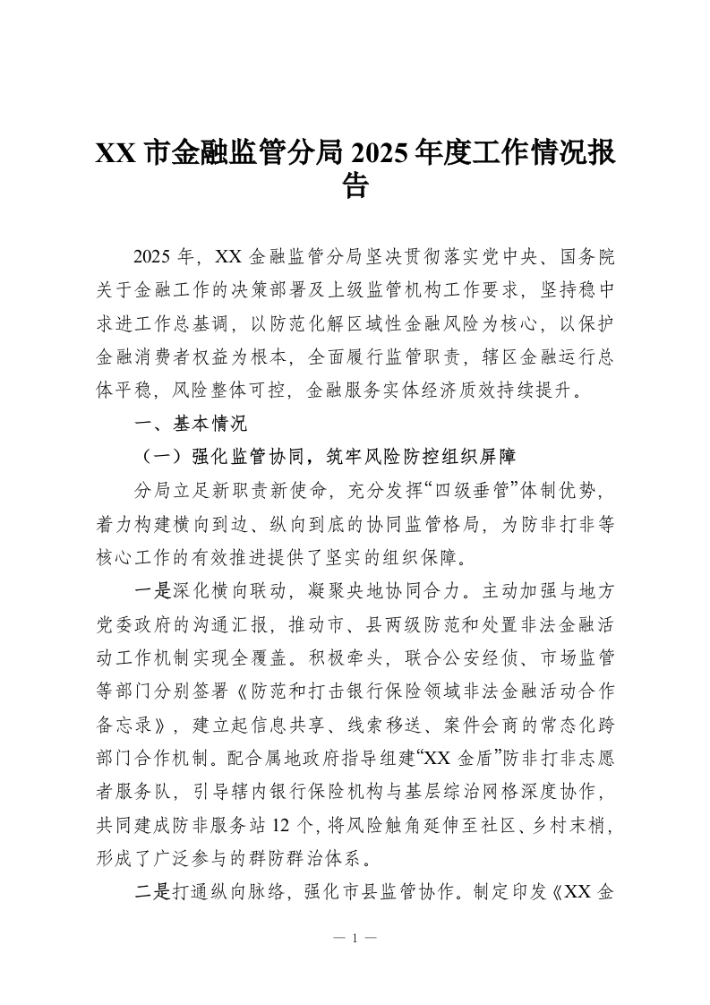 XX市金融监管分局2025年度工作情况报告