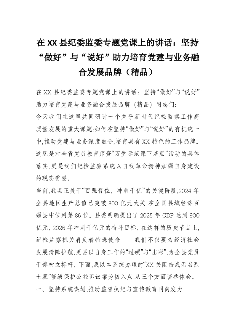 在XX县纪委监委专题党课上的讲话:坚持“做好”与“说好”助力培育党建与业务融合发展品牌(精品)