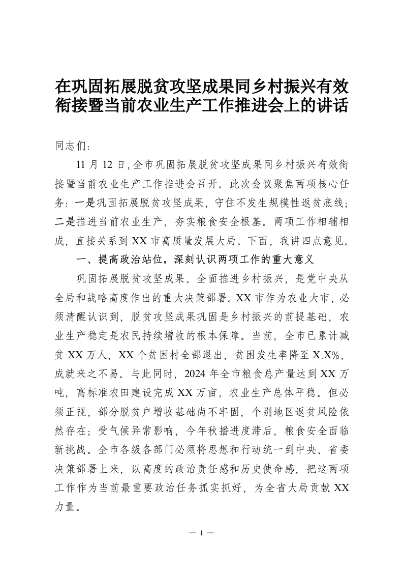 在巩固拓展脱贫攻坚成果同乡村振兴有效衔接暨当前农业生产工作推进会上的讲话