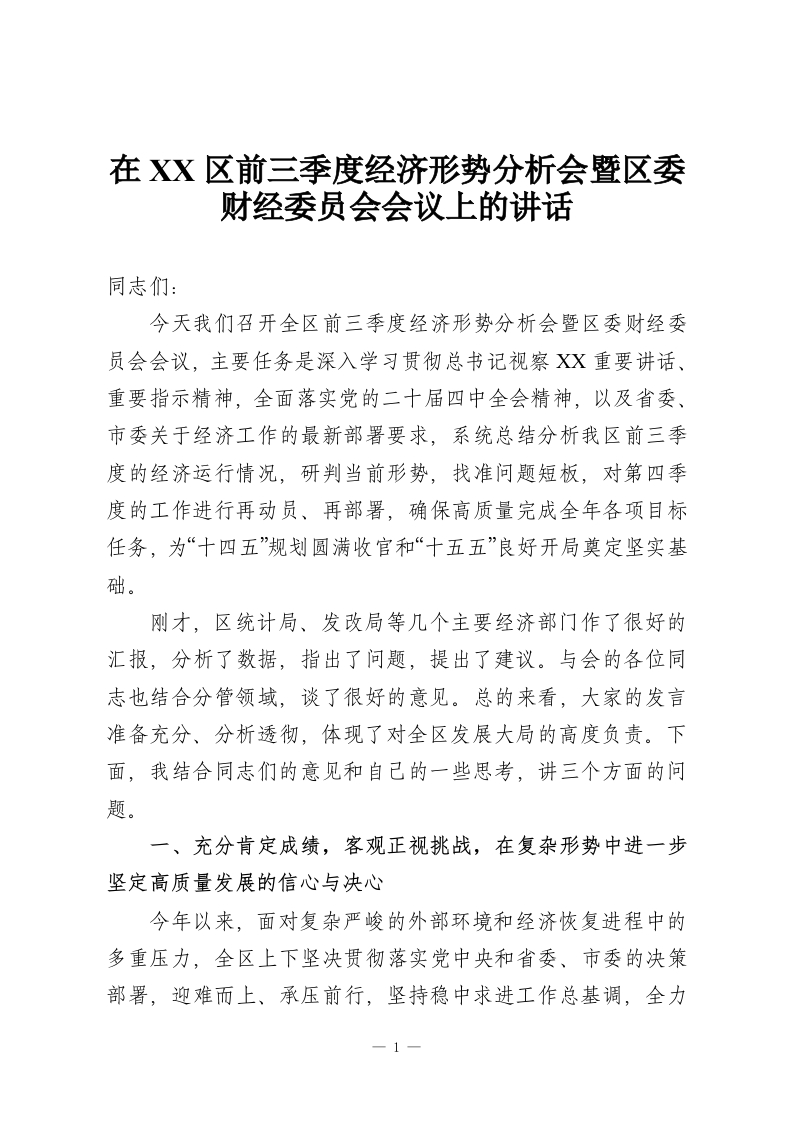 在XX区前三季度经济形势分析会暨区委财经委员会会议上的讲话
