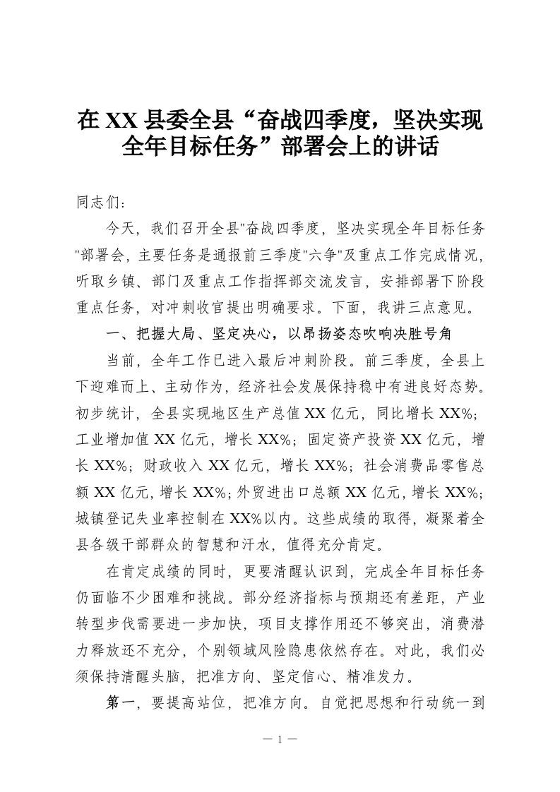 在XX县委全县“奋战四季度,坚决实现全年目标任务”部署会上的讲话