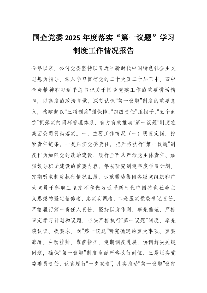 国企党委2025年度落实“第一议题”学习制度工作情况报告