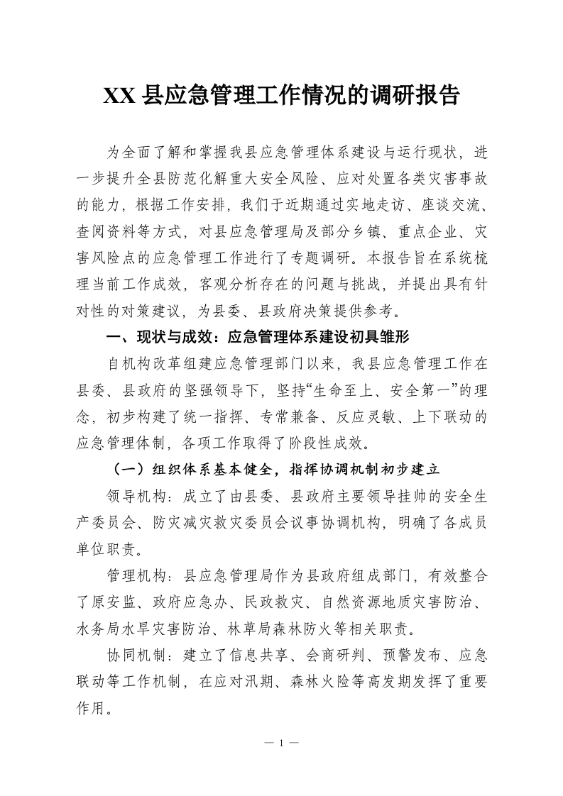 XX县应急管理工作情况的调研报告