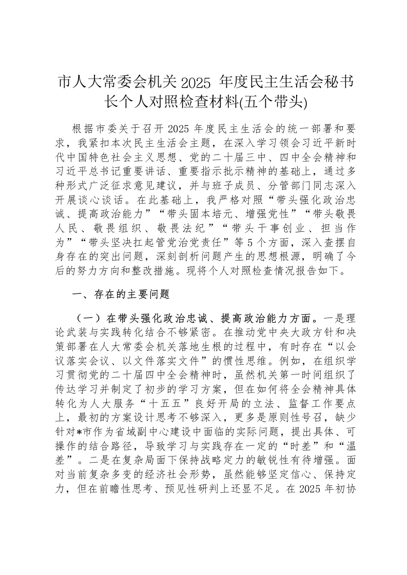 市人大常委会机关2025年度民主生活会秘书长个人对照检查材料(五个带头)
