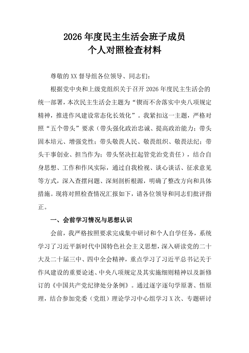 2026年度民主生活会班子成员个人对照检查材料
