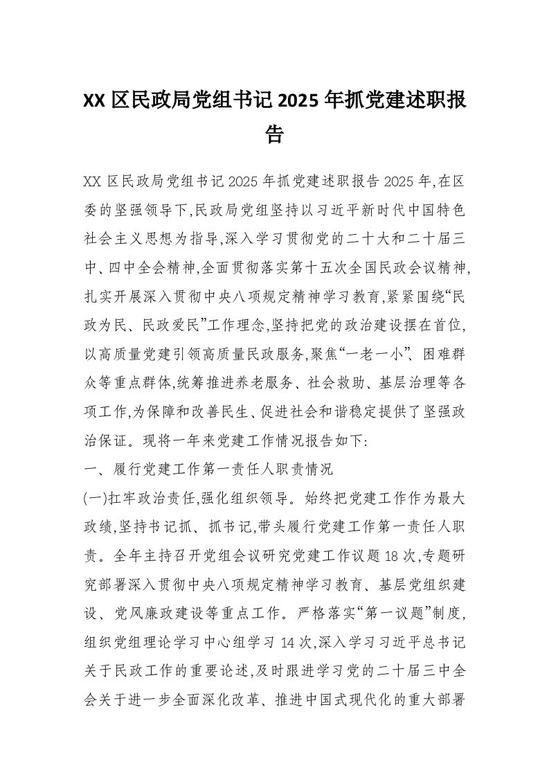 XX区民政局党组书记2025年抓党建述职报告