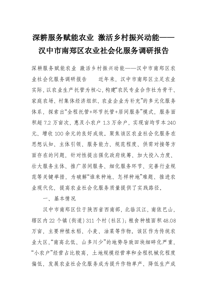 首页学习提升深耕服务赋能农业 激活乡村振兴动能——汉中市南郑区农业社会化服务调研报告