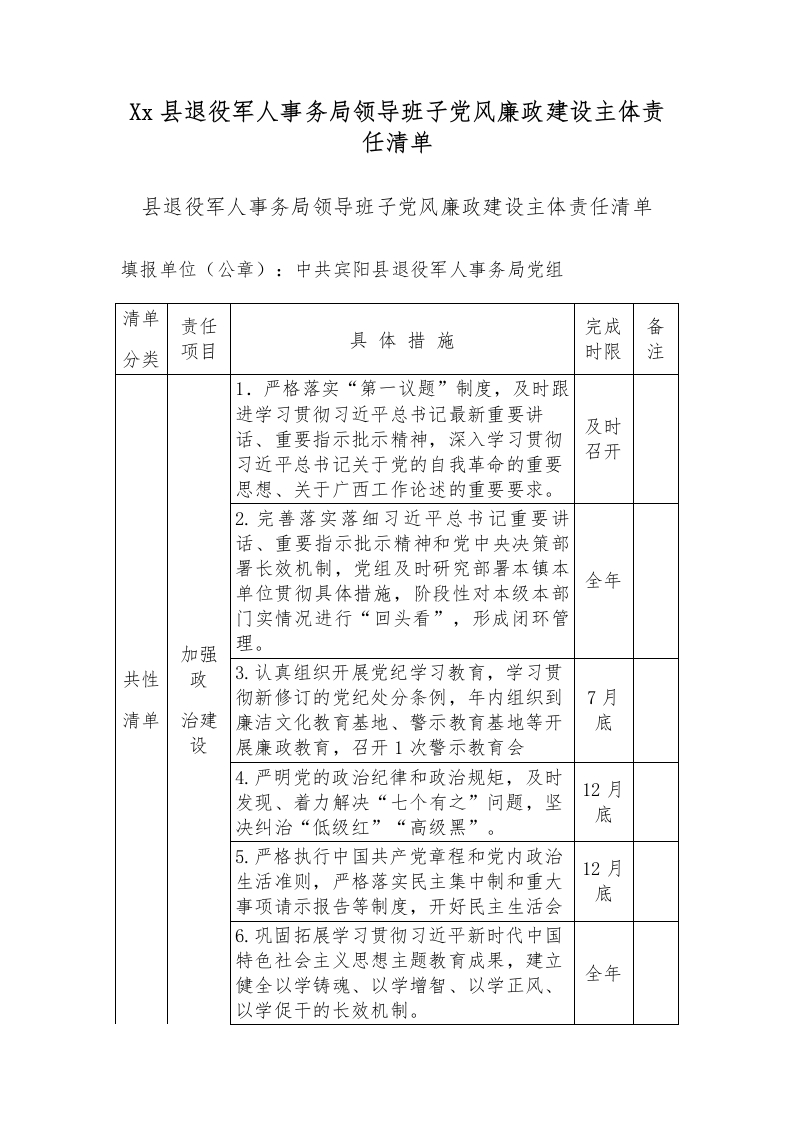 首页办公表格Xx县退役军人事务局领导班子党风廉政建设主体责任清单