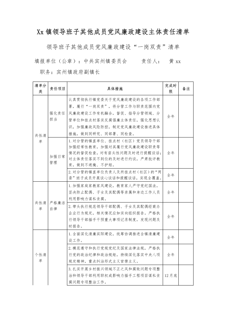 首页办公表格Xx镇领导班子其他成员党风廉政建设主体责任清单