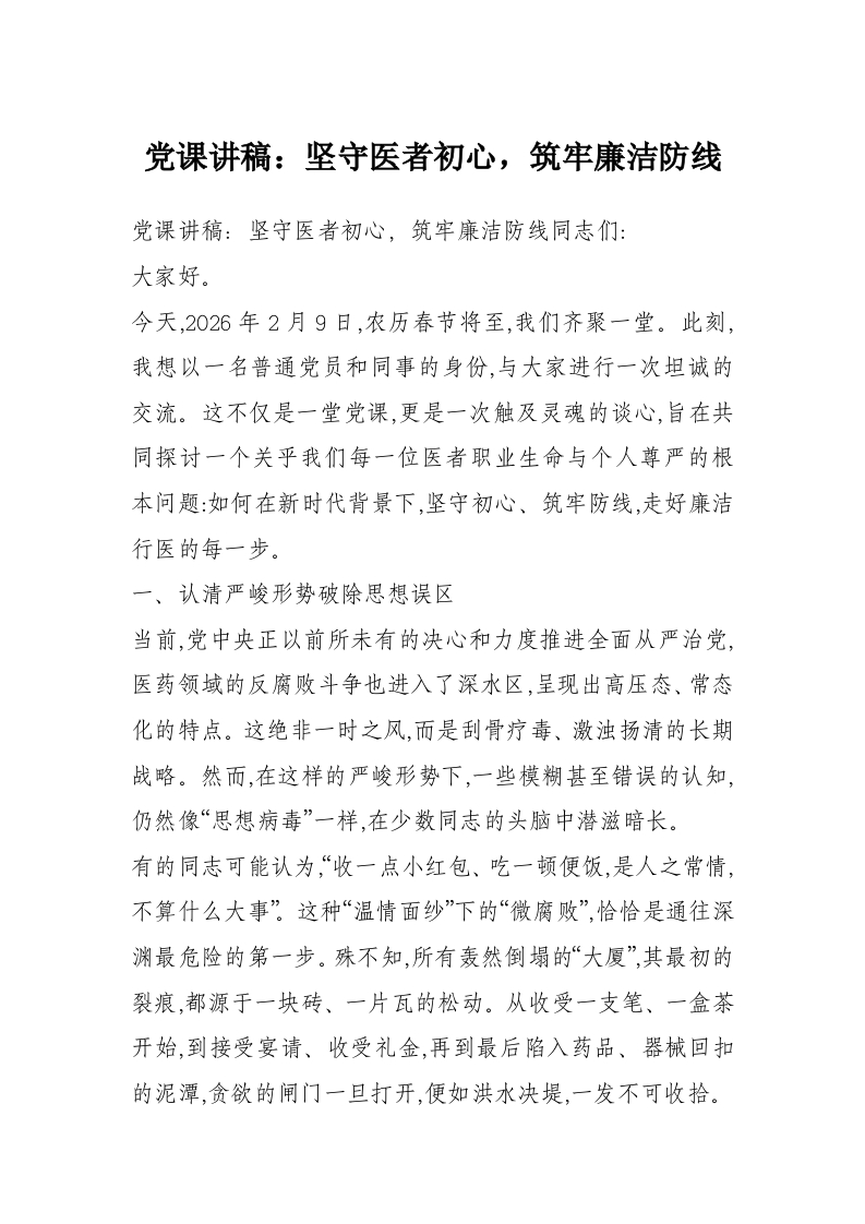 党课讲稿:坚守医者初心,筑牢廉洁防线