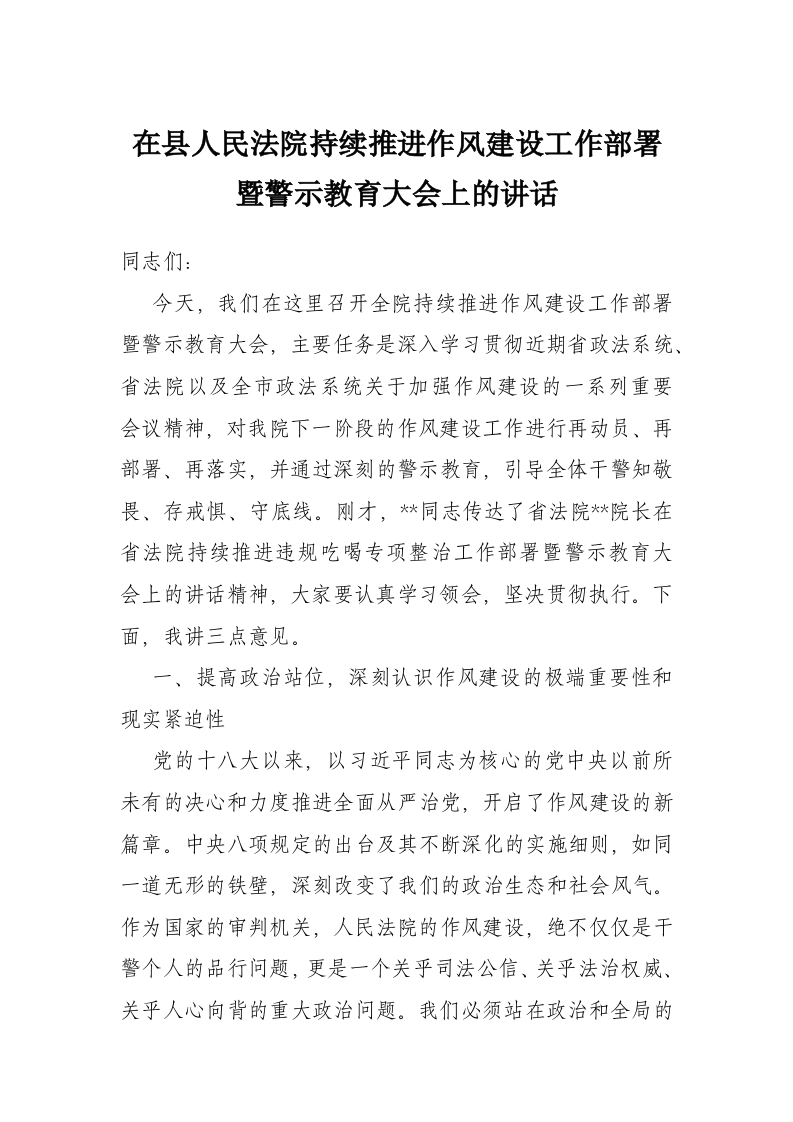 在县人民法院持续推进作风建设工作部署暨警示教育大会上的讲话