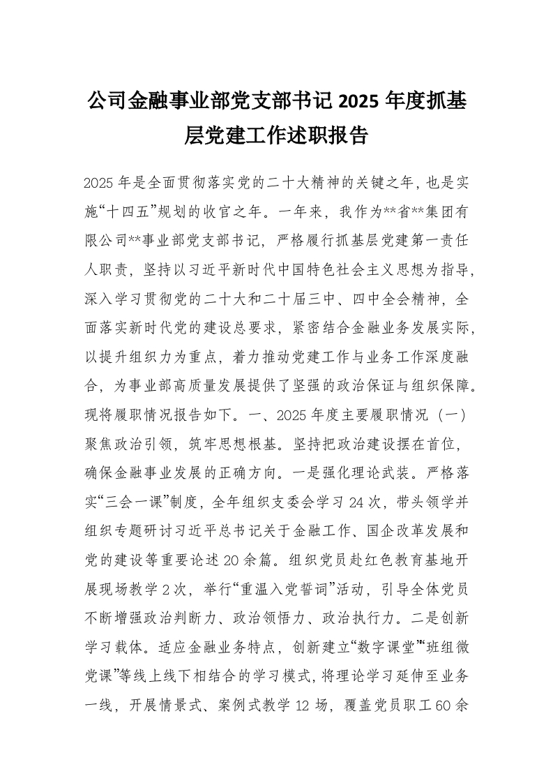 首页工作文档公司金融事业部党支部书记2025年度抓基层党建工作述职报告