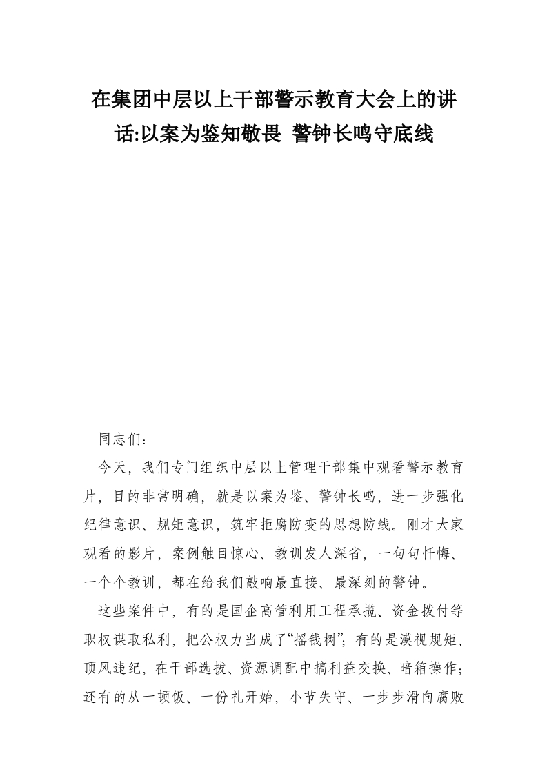 首页工作文档在集团中层以上干部警示教育大会上的讲话-以案为鉴知敬畏 警钟长鸣守底线